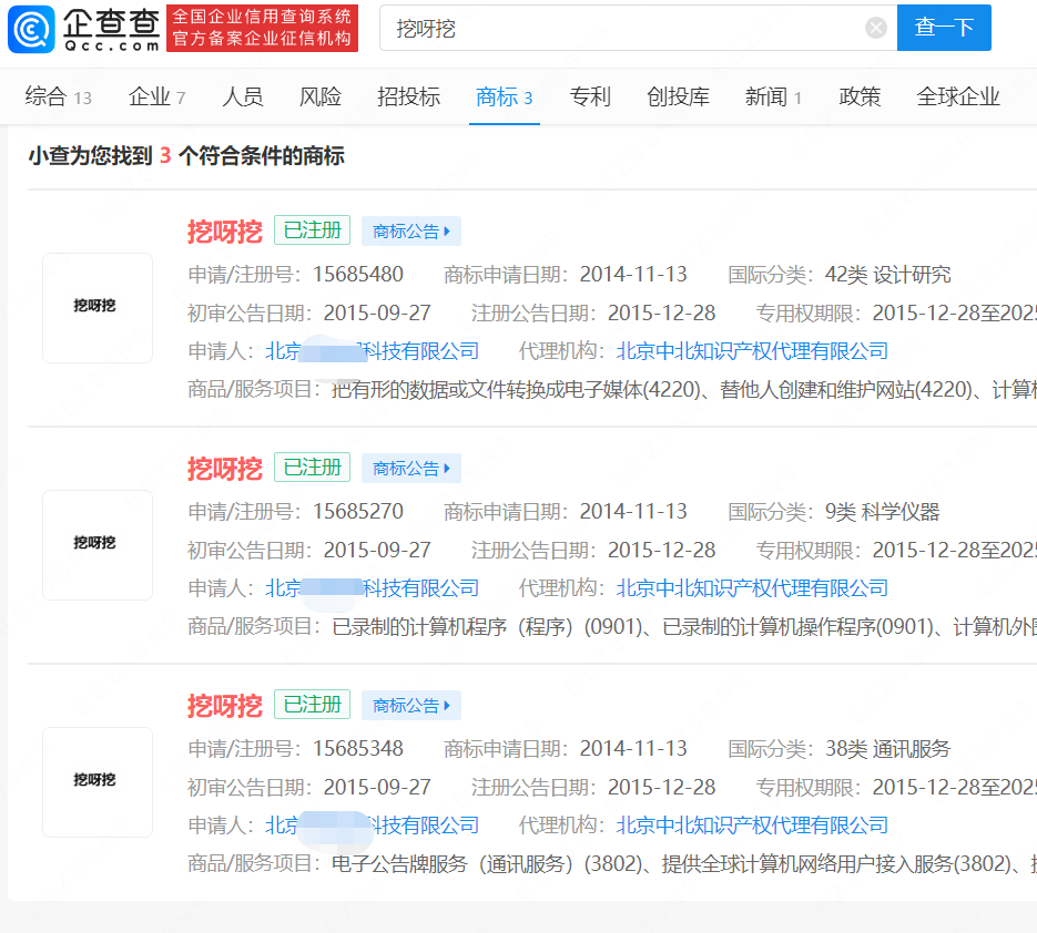 企查查APP显示,“挖呀挖”已经被北京某科技公司申请注册成商标,国际分类为设计研究、科学仪器、通讯服务,3枚商标状态均为“已注册”。