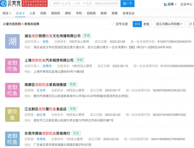 近日,“老默我想吃鱼了”和“想吃鱼了”商标被抢注,申请人分别为自然人杨某某和上海某宠物服务公司,国际分类为广告销售、食品,当前商标状态均为申请中。此外,多家新成立的企业也用这一热梗命名,包括湖北老默我想吃鱼文化传播有限公司、洛阳我想吃鱼了餐饮管理有限公司、上海老默吃鱼汽车租赁有限公司等,这些企业均成立于今年2月。